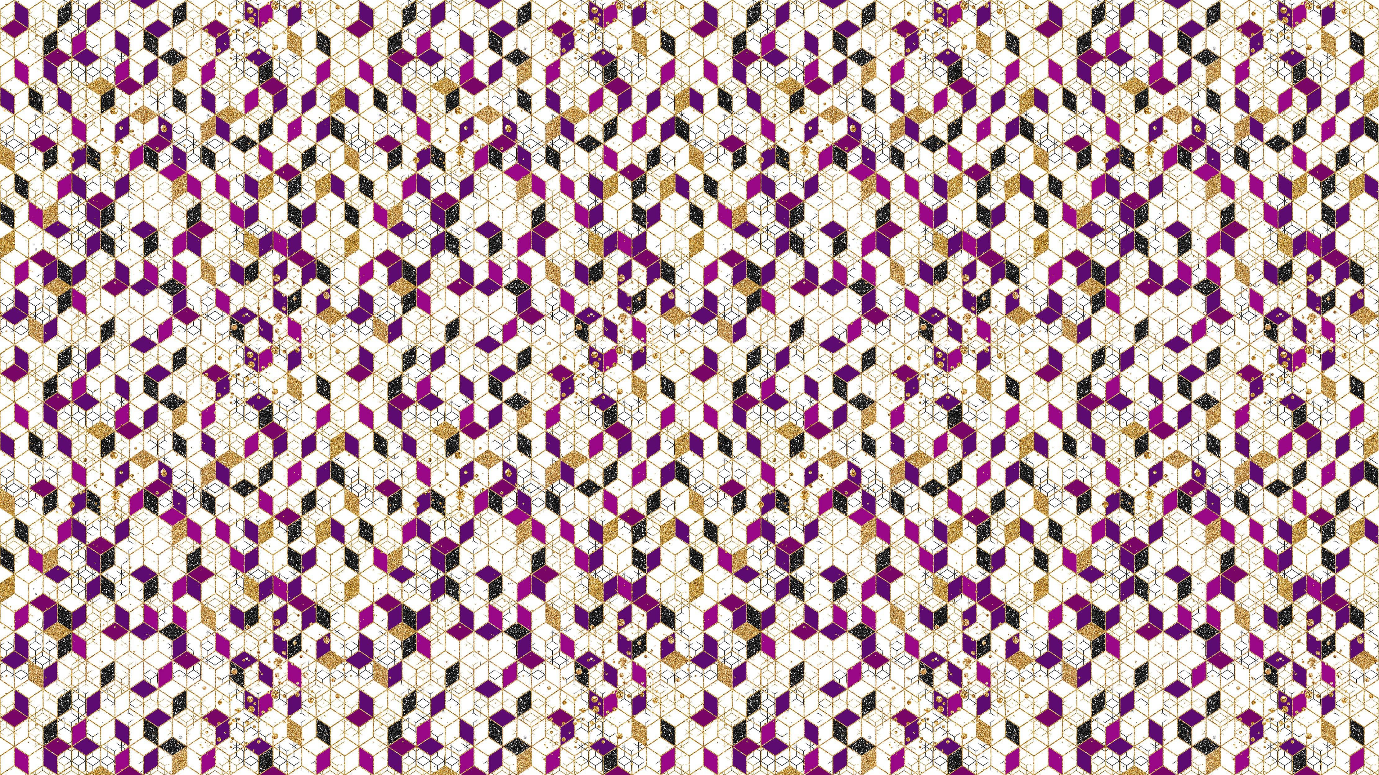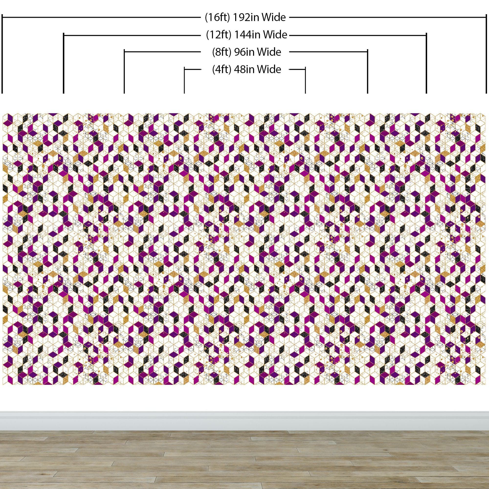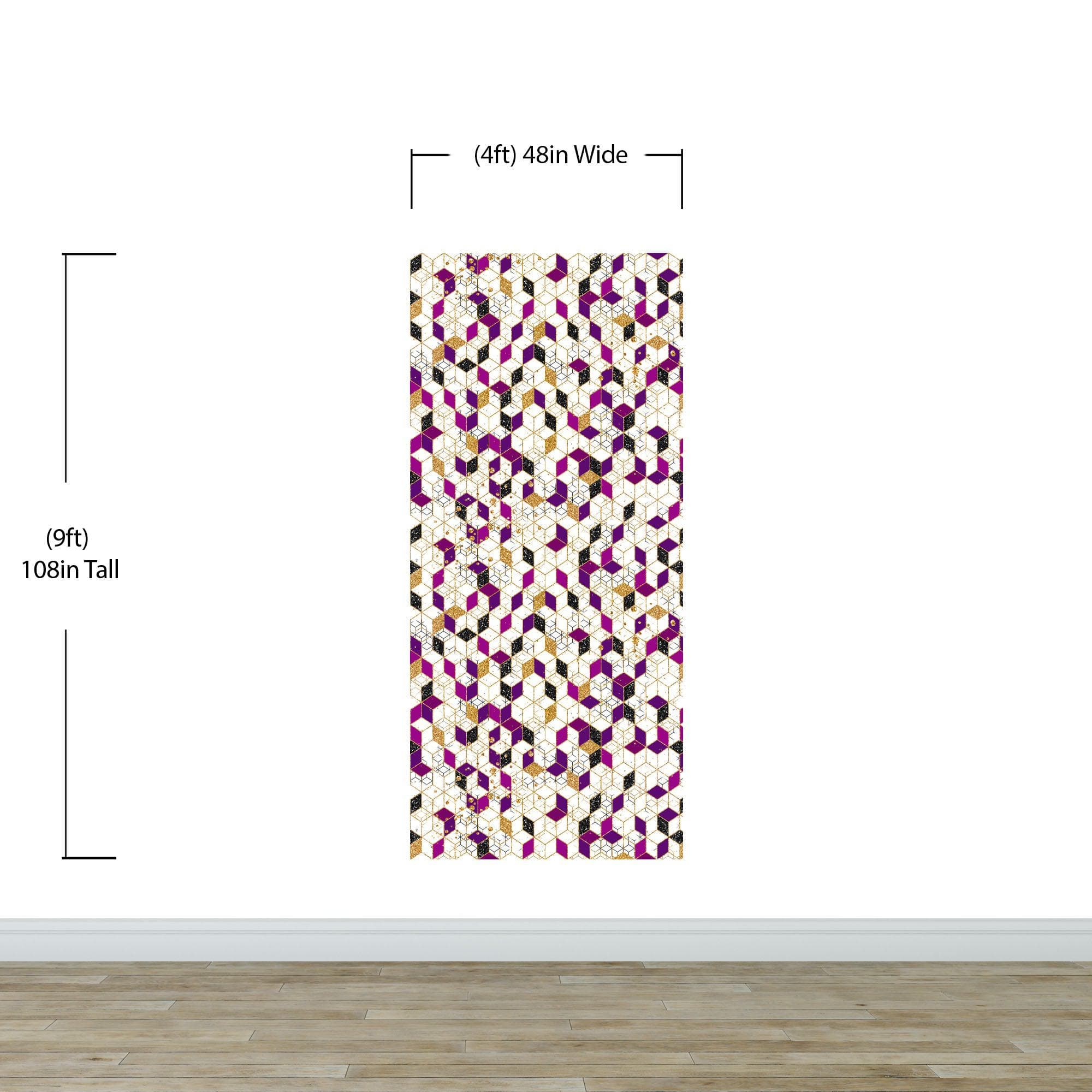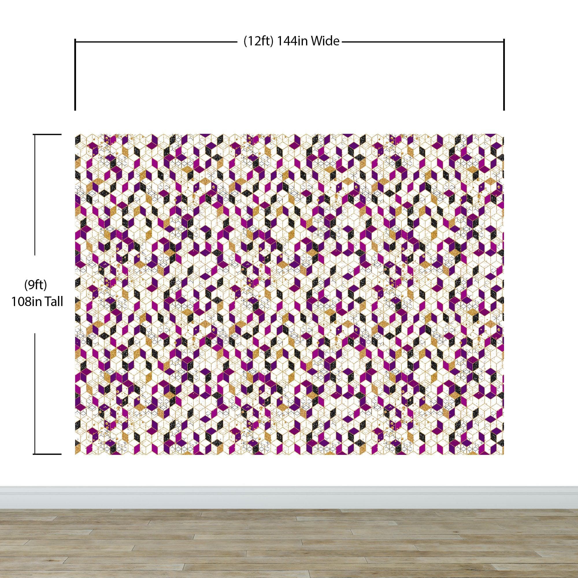 Mural de pared abstracto con forma de cubo en 3D. Papel tapiz despegable y adhesivo minimalista en morado y dorado con forma de cubo geométrico. #6380
