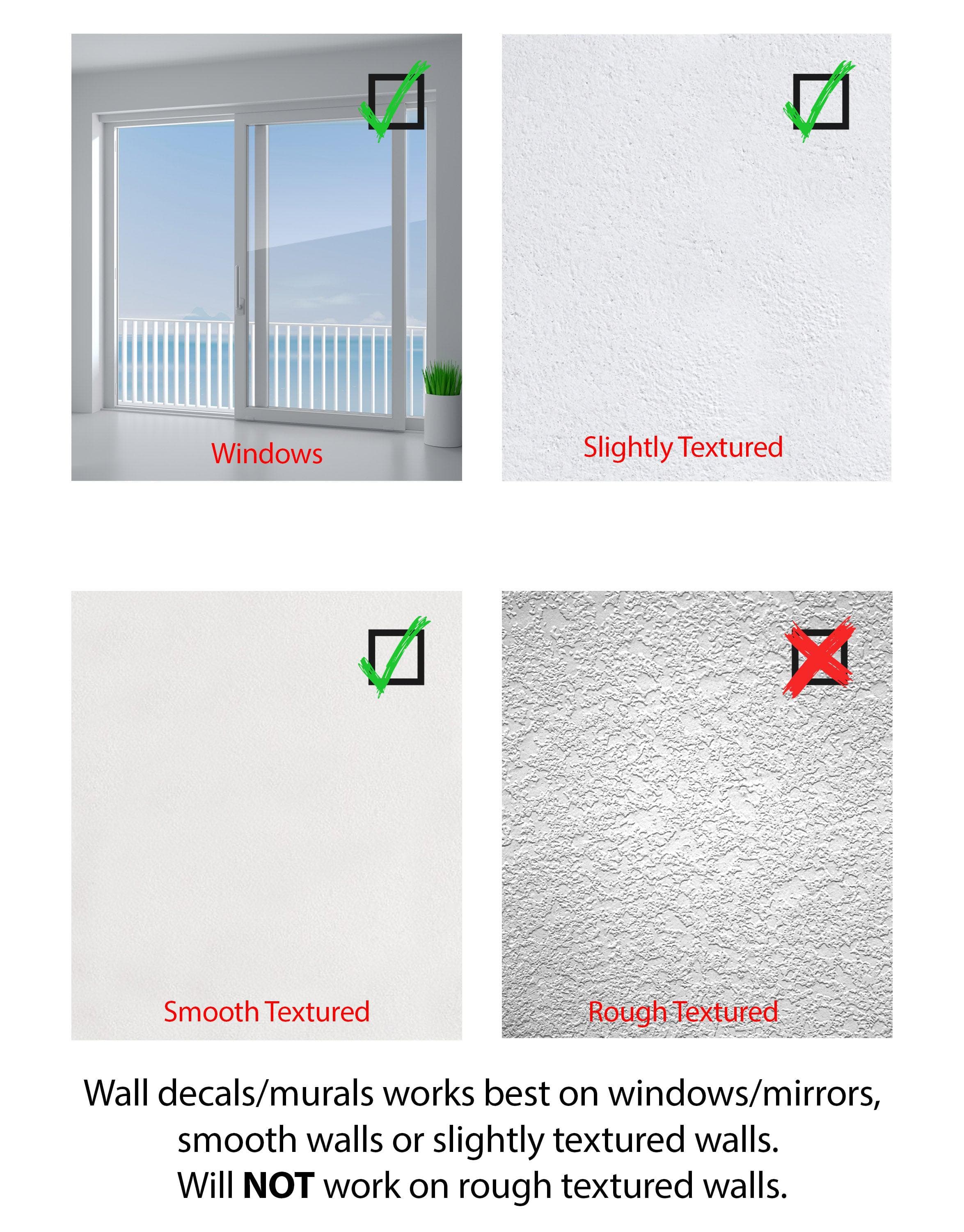 • Los murales de pared se pueden aplicar en la mayoría de las superficies planas, incluidas paredes con texturas leves, ventanas o espejos. No se pueden aplicar en paredes con mucha textura. No apto para uso en exteriores.