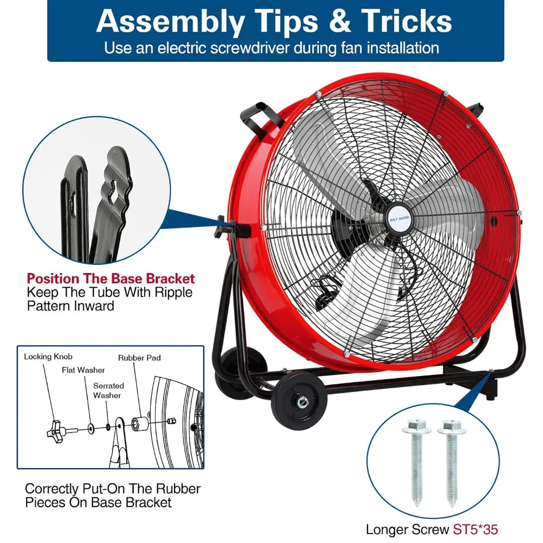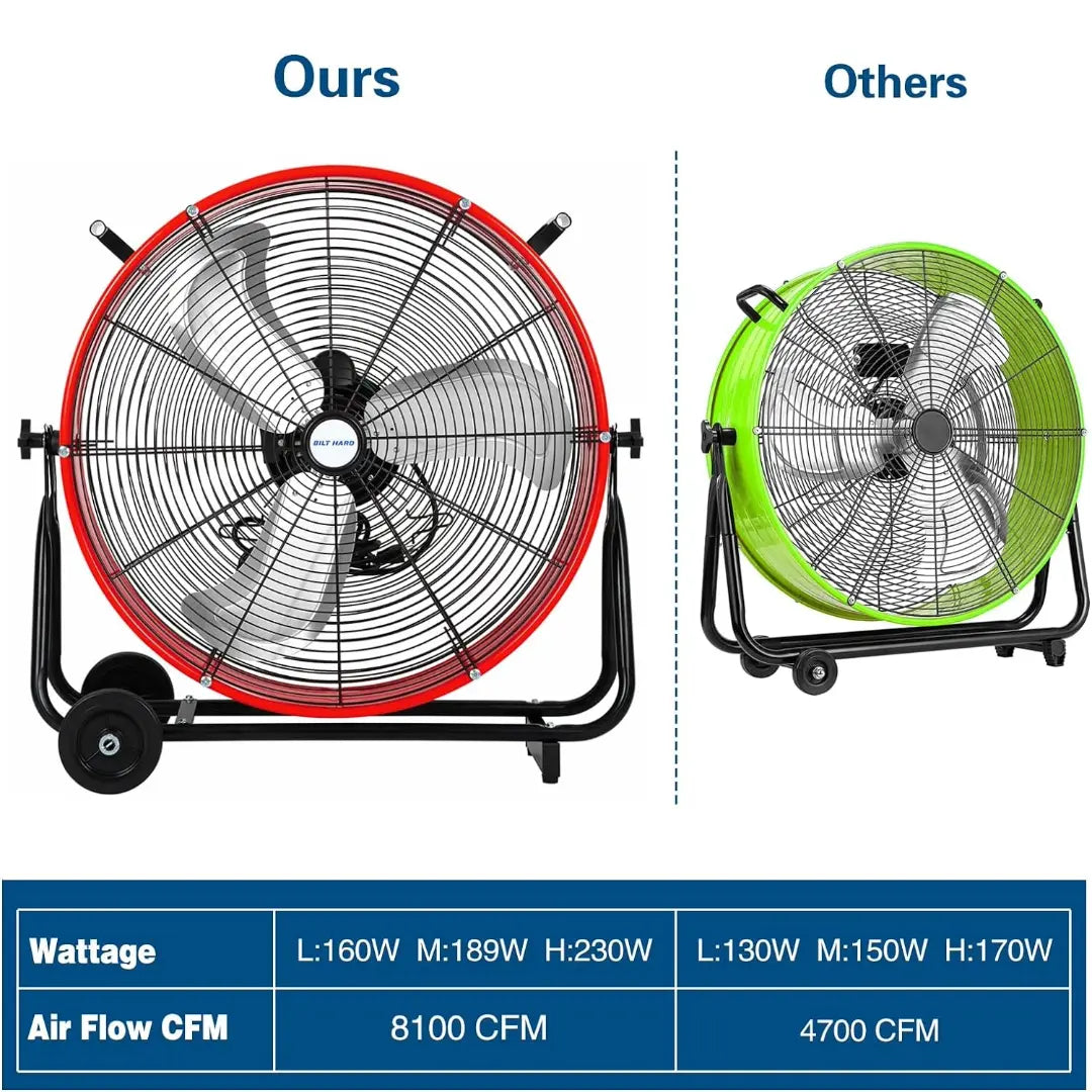 Ventilador de tambor de alta velocidad BILT HARD de 24" y 8100 CFM: Ventilador metálico de 3 velocidades para trabajo pesado, homologado por UL