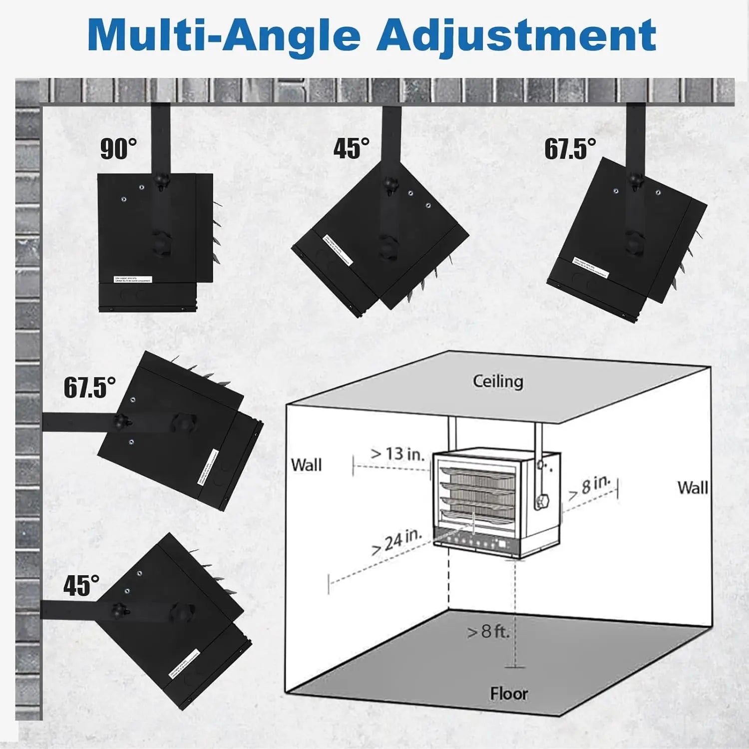 With a digital display and remote control, managing your heater’s settings is simple and convenient, making it ideal for ceiling-mounted setups in garages, warehouses, or workshops.