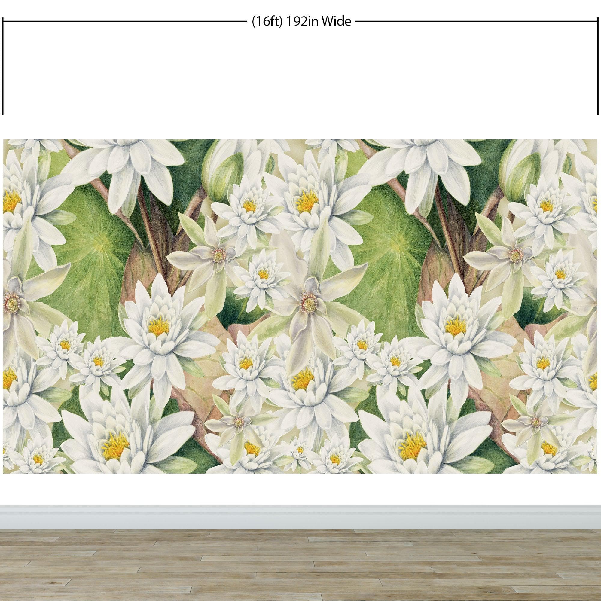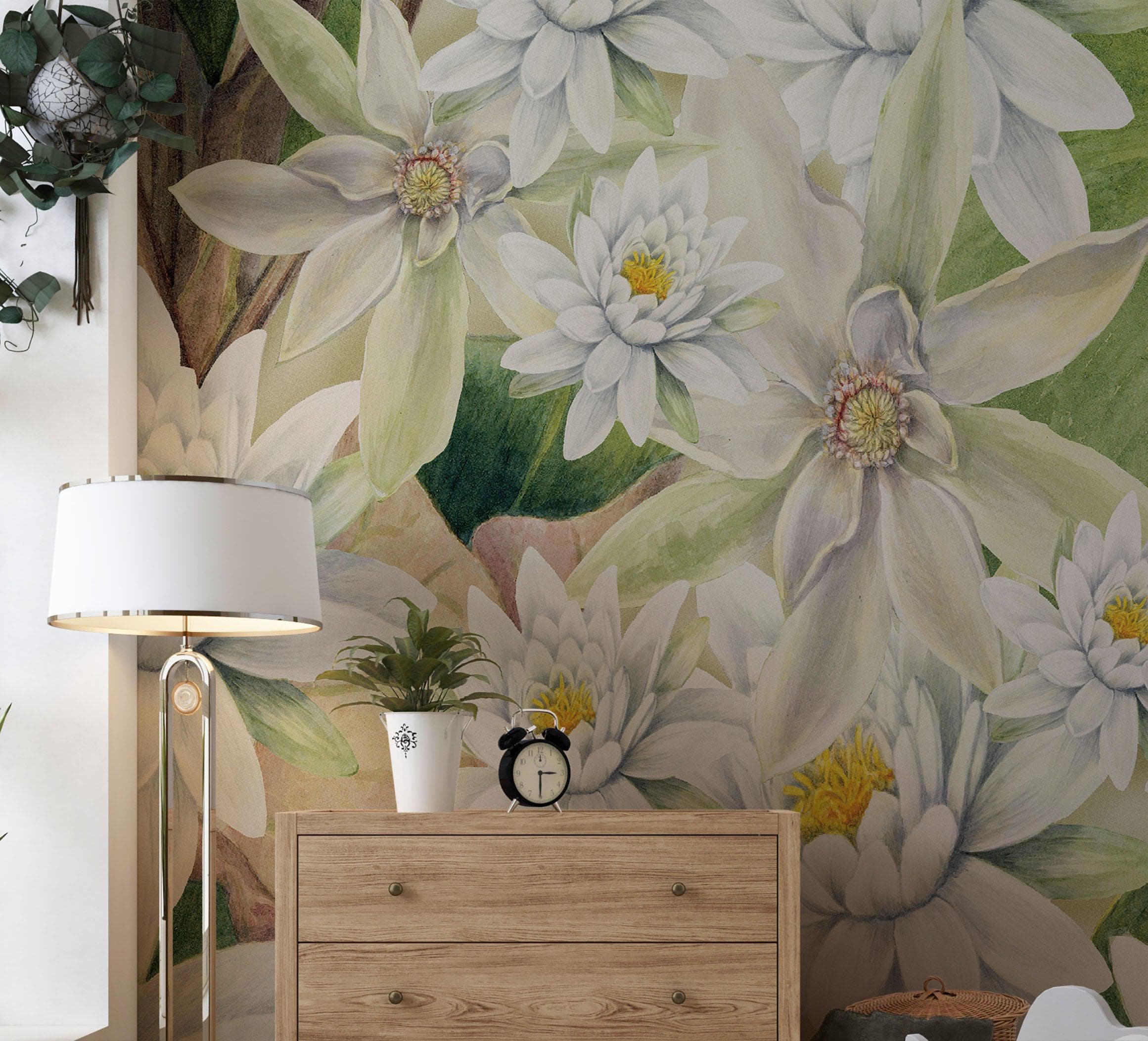 Mural de pared con flores botánicas. Ilustración a lápiz de color de un jardín de flores. Papel tapiz autoadhesivo. Flores botánicas del paraíso y hojas sobre fondo negro. #6426