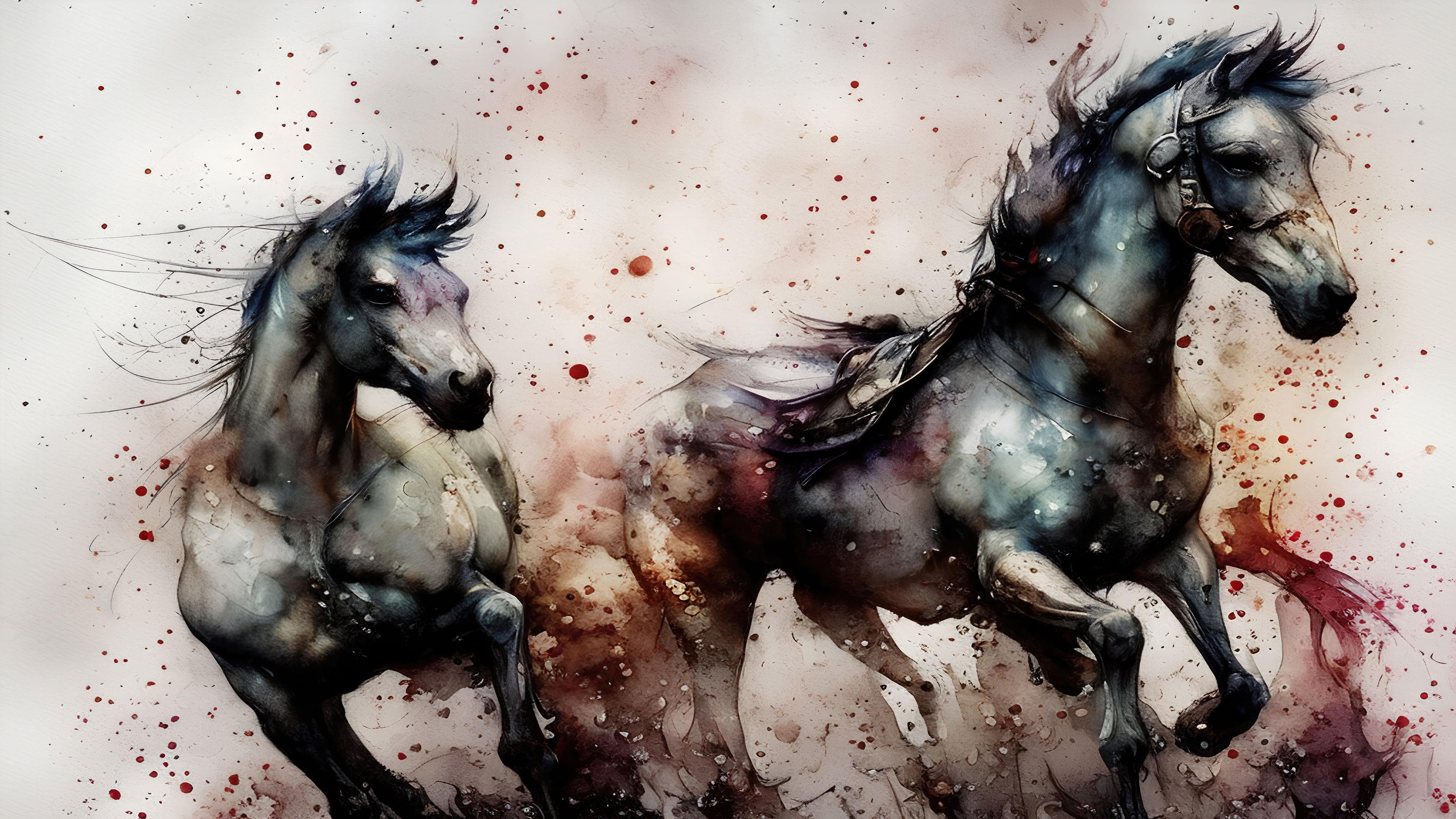 • Una pintura de acuarela de caballos al galope muestra caballos corriendo con un movimiento fluido y elegante, con sus crines y colas ondeando al viento. La naturaleza suave y fluida de la acuarela permite una interpretación onírica e impresionista del tema, creando una imagen hermosa y dinámica en la pared.