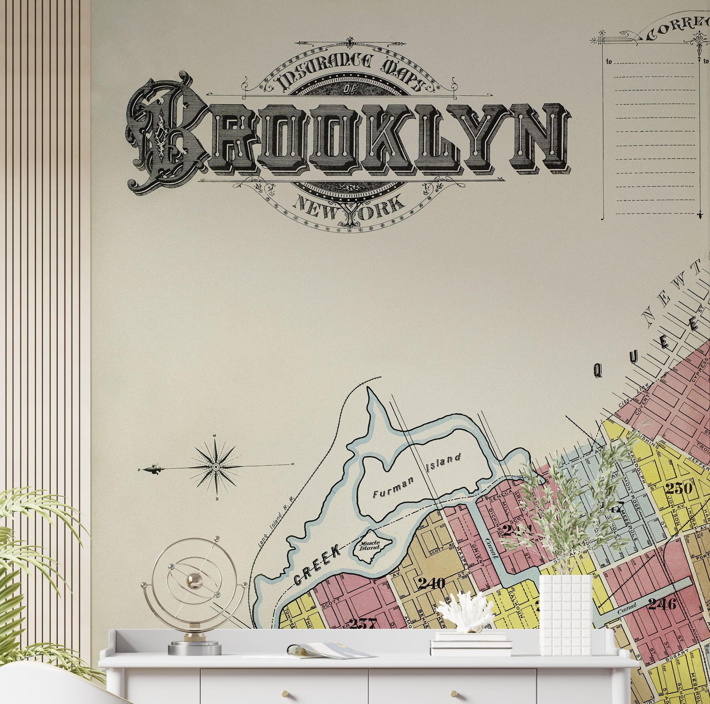 Mural de pared con mapa retro vintage de Brooklyn, Nueva York. Papel tapiz autoadhesivo con mapa de la ciudad de Nueva York de 1888. N.º 6410