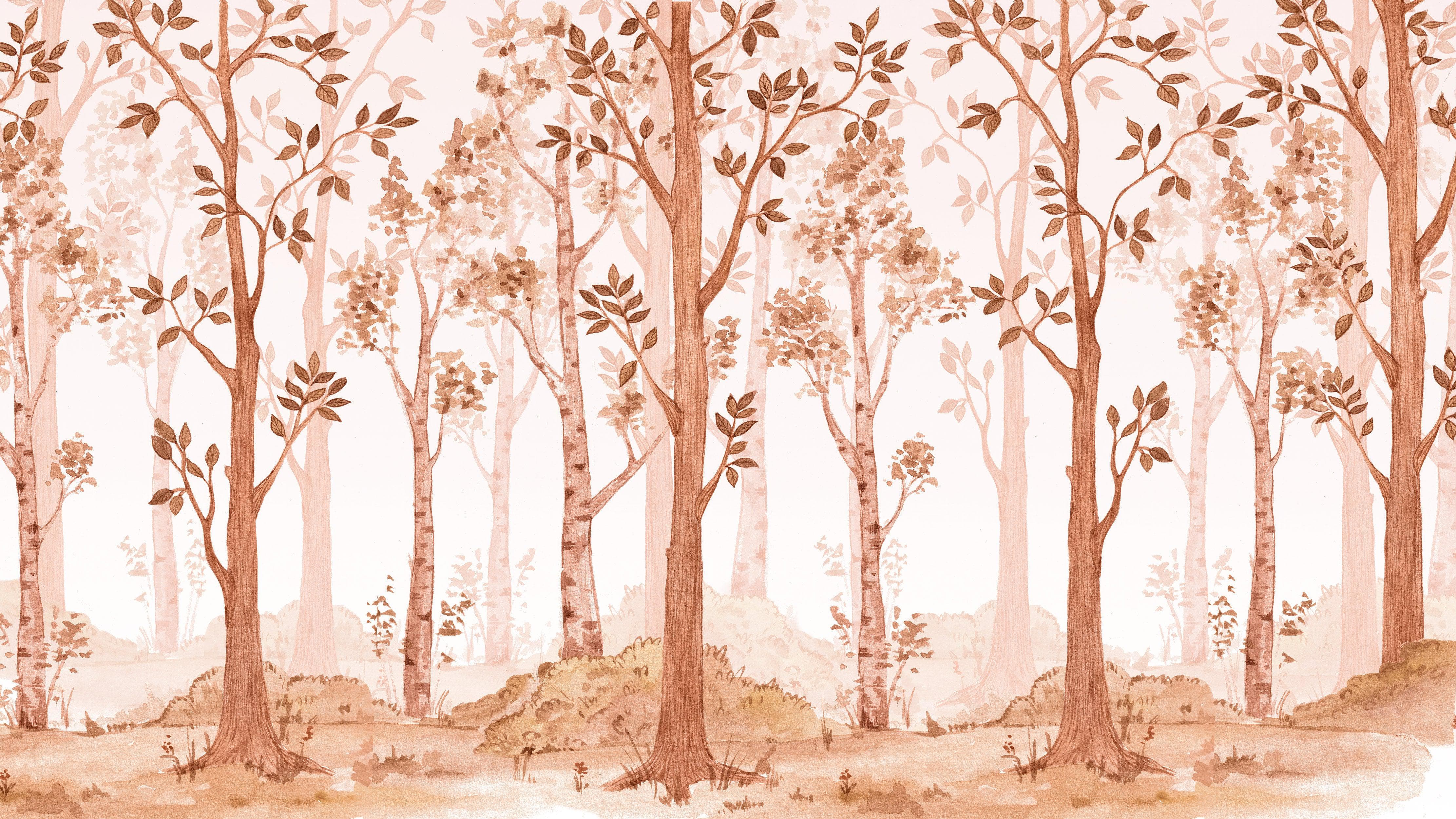 Papel tapiz de bosque de vivero en tonos sepia. Mural de pared con bosque de abedules en acuarela. #6526