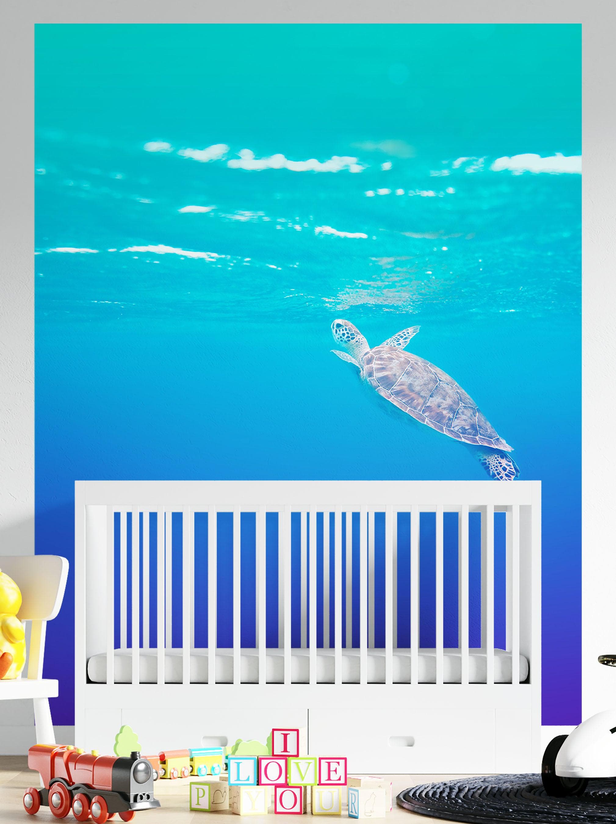 Mural de pared con tortuga marina nadando y tomando aire. Animales marinos en colores pastel. Papel tapiz autoadhesivo. N.º 6406