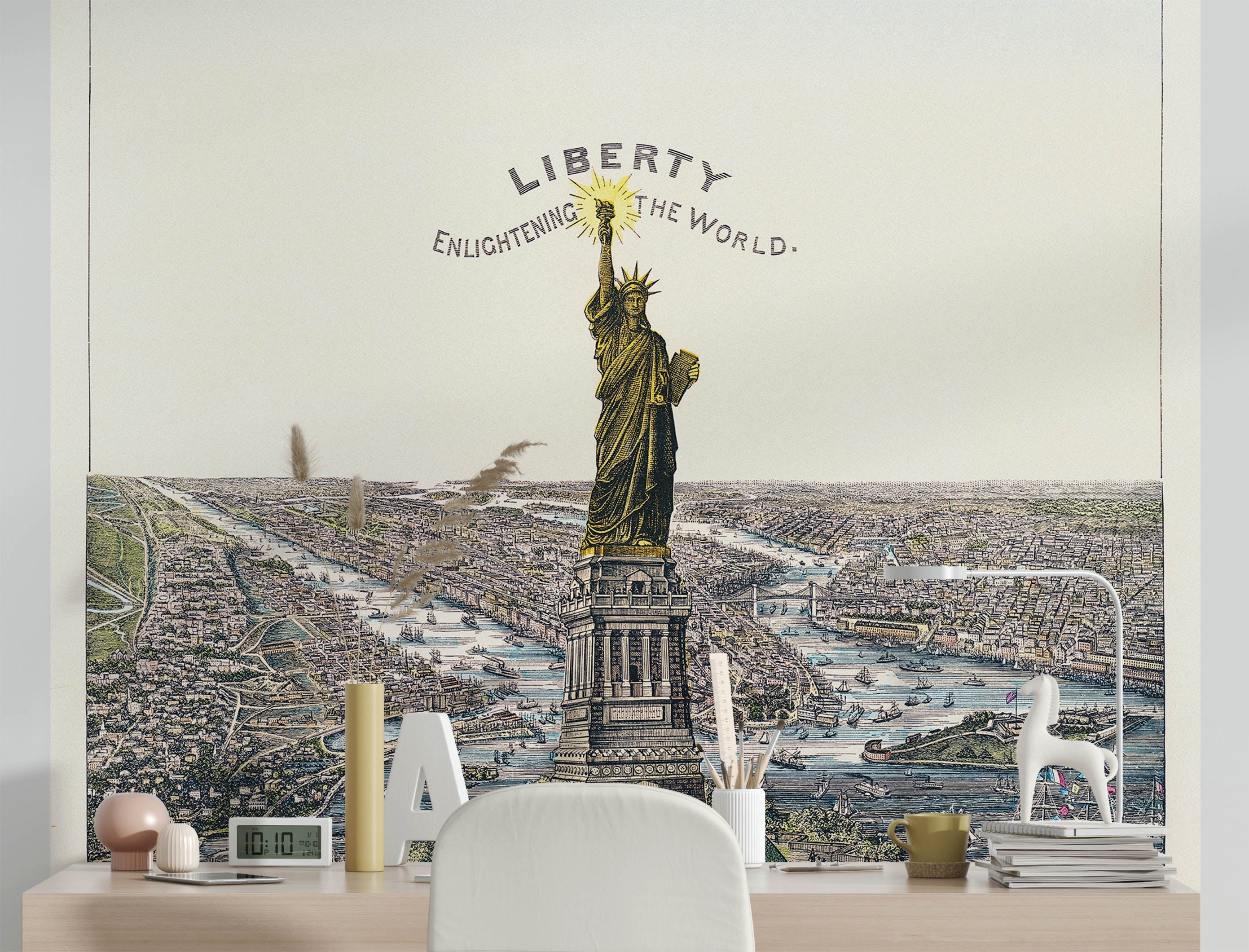 Ilustración vintage del mural de pared de la Estatua de la Libertad. La gran estatua de Bartholdi, la libertad que ilumina el mundo. Papel pintado autoadhesivo. #6409