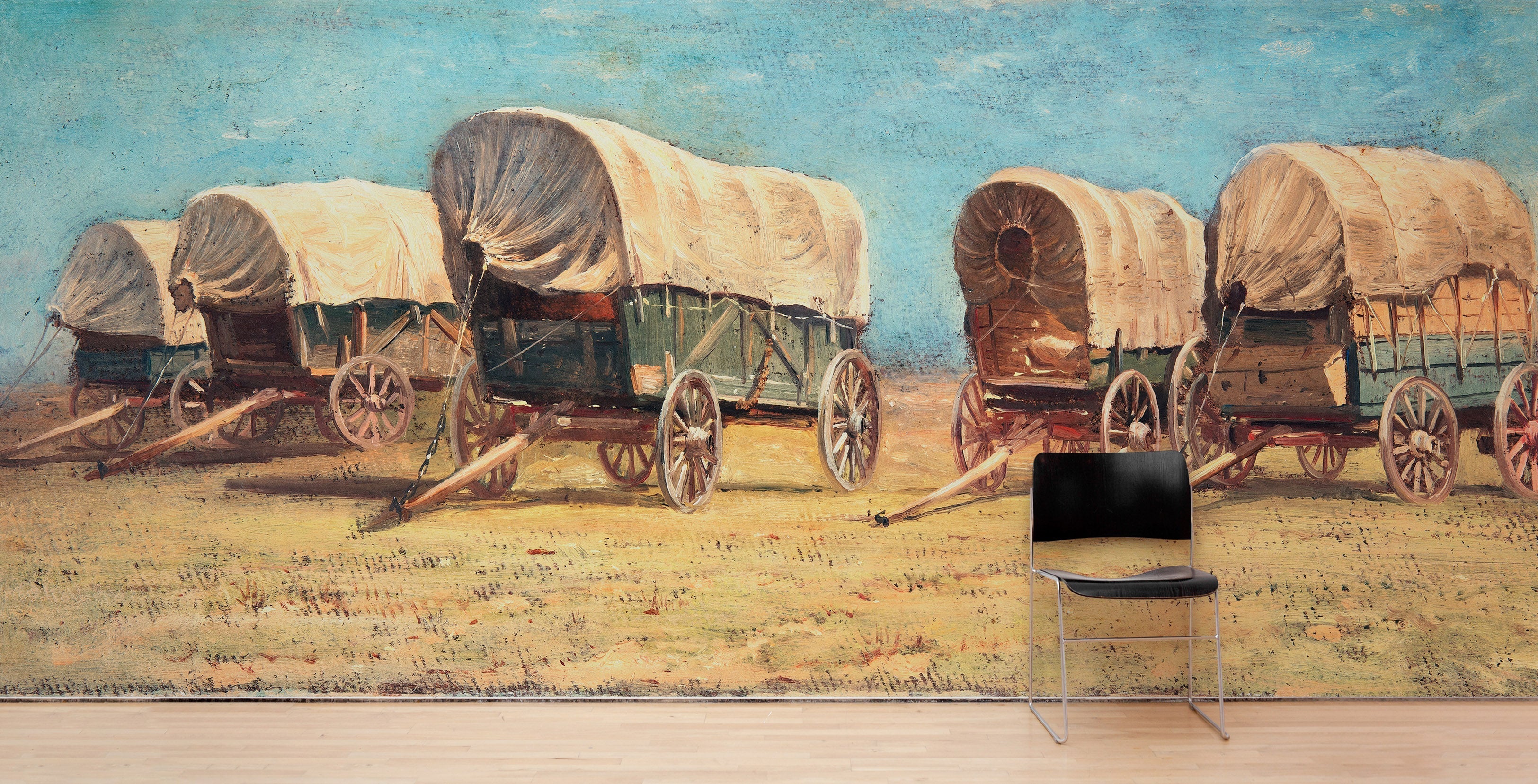 Mural de pared con temática de vaqueros del Oeste. Estudio de carros cubiertos de Samuel Colman. Obra de arte en pintura. Papel tapiz autoadhesivo. N.º 6339