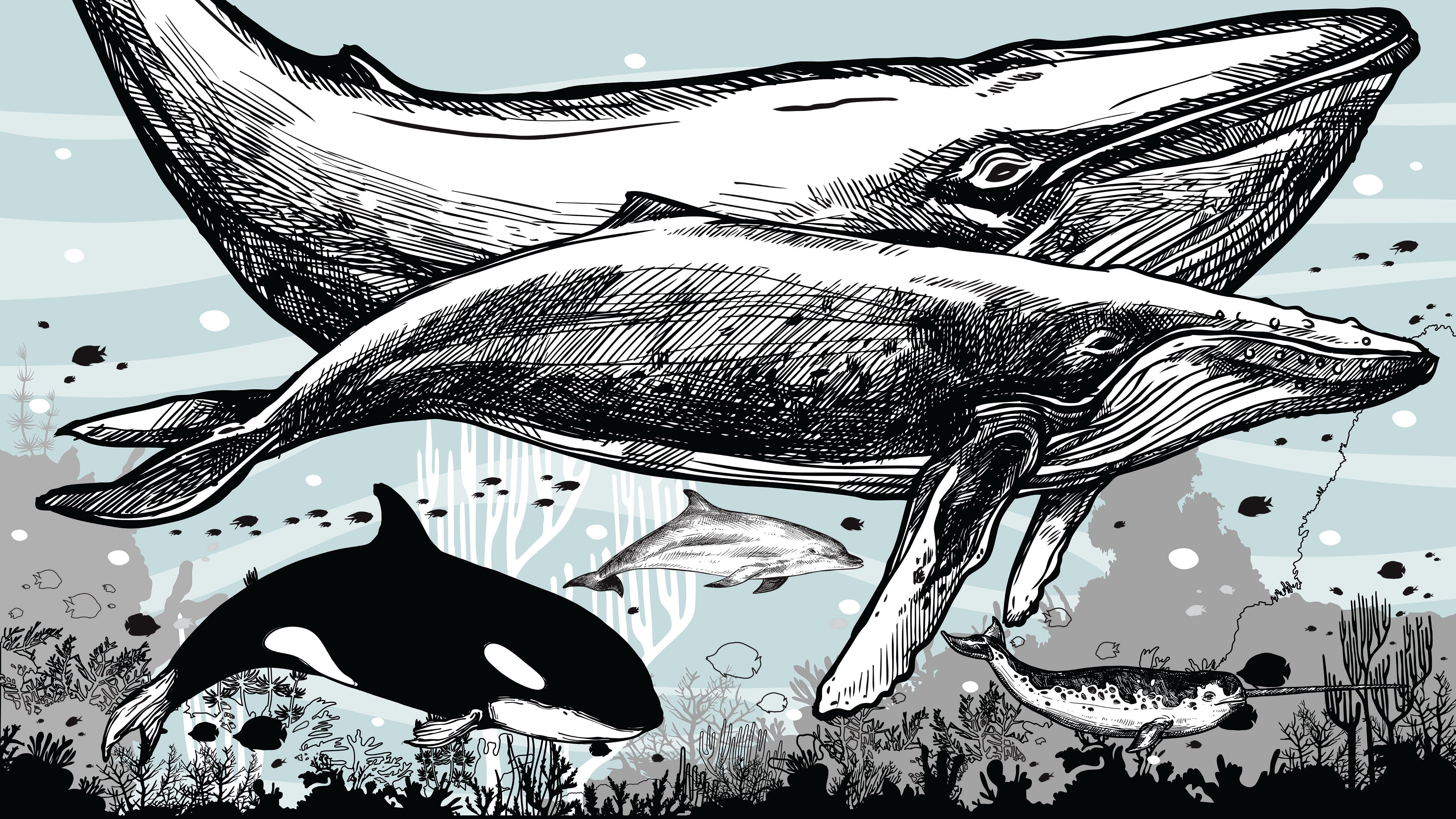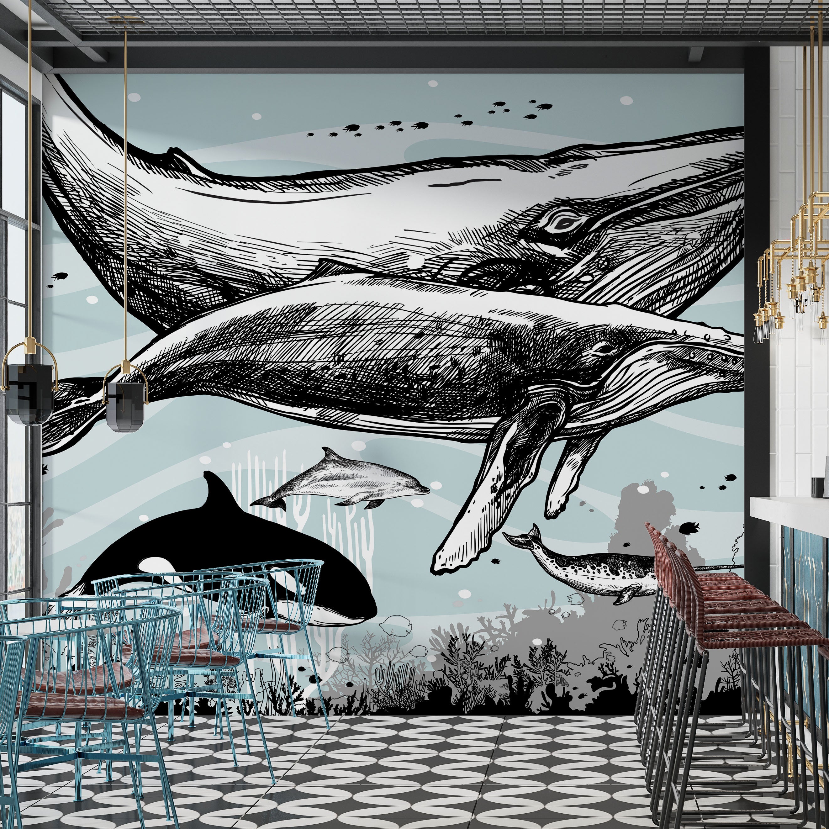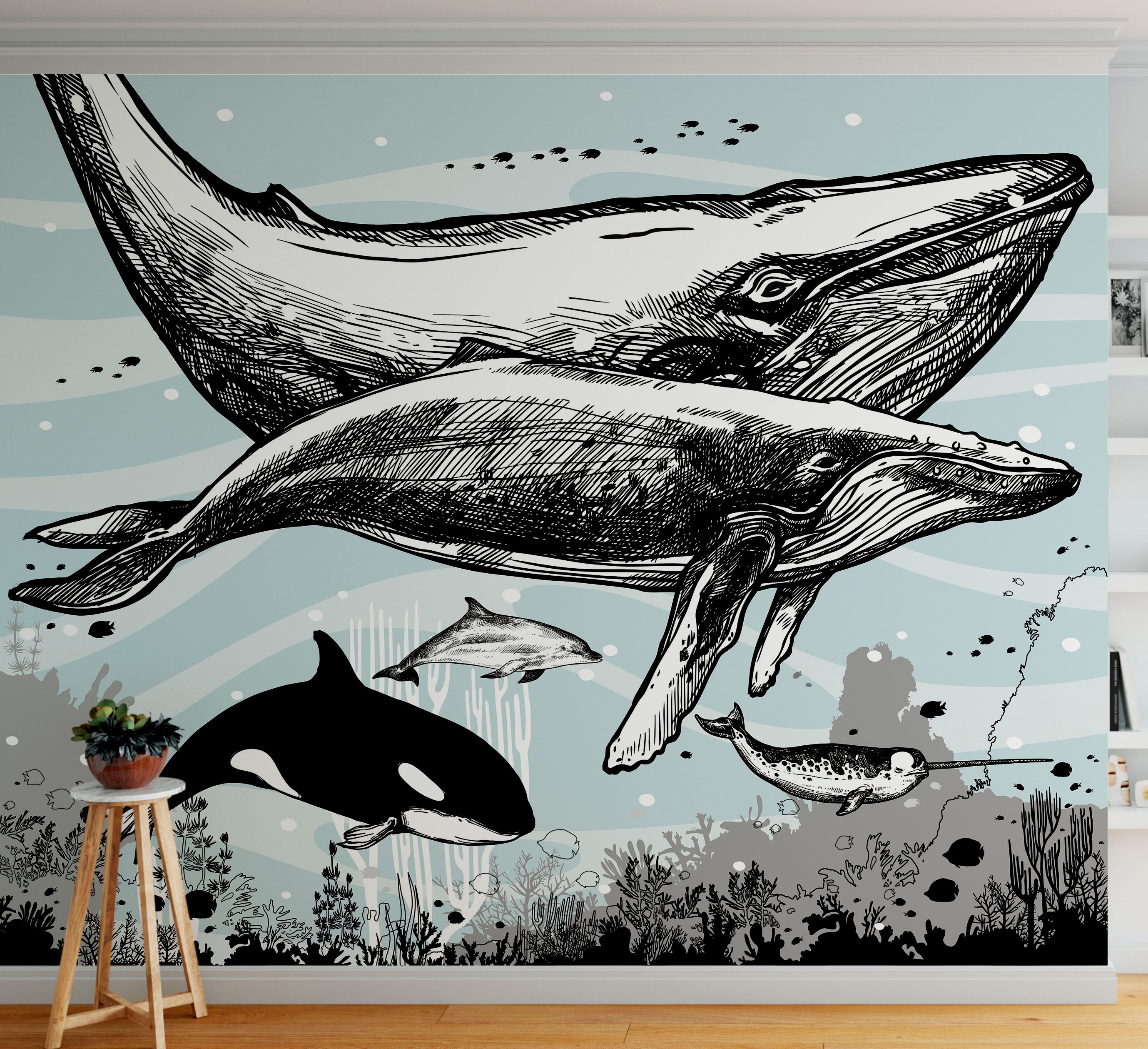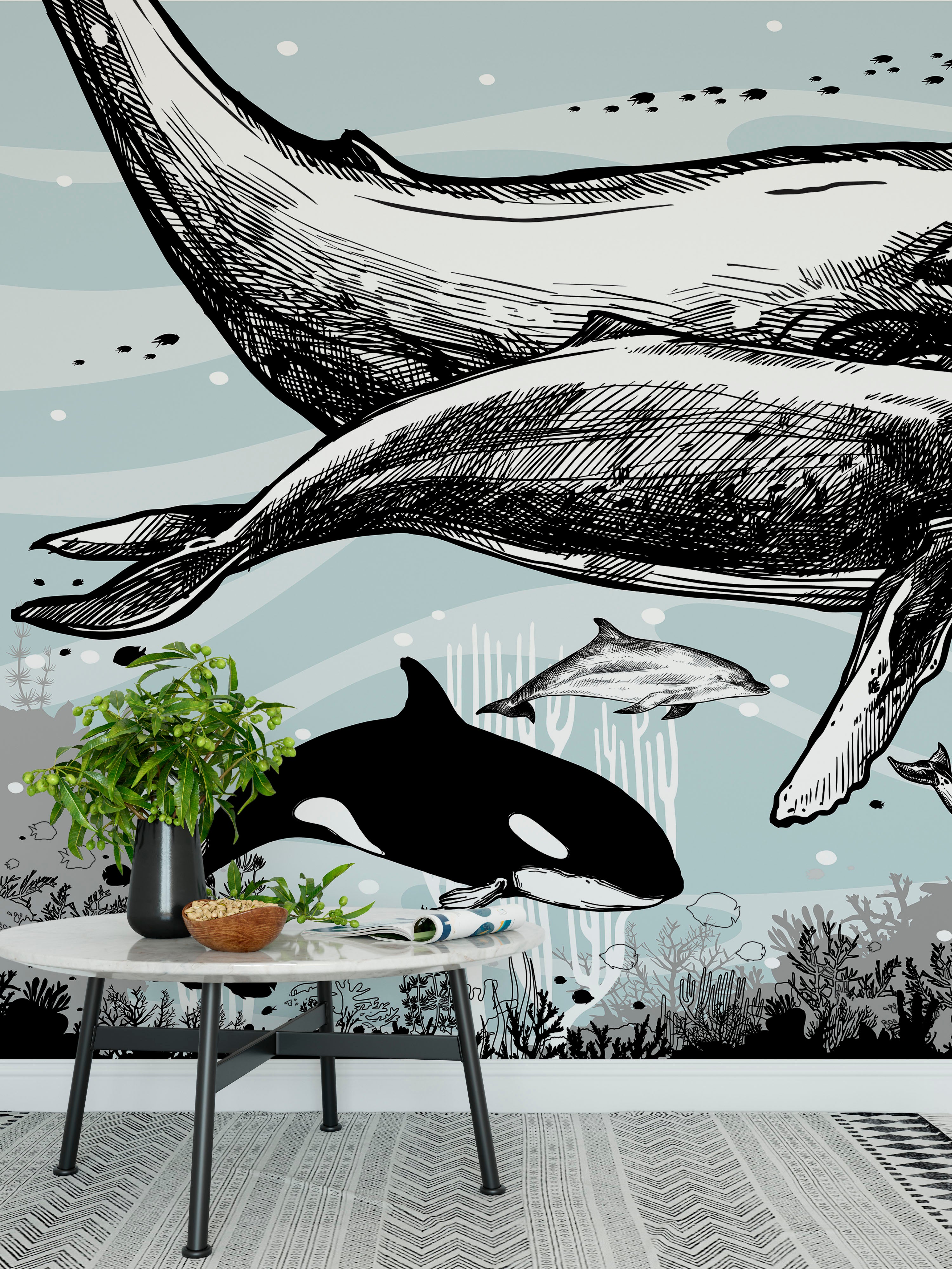 Mural de pared con ballena, delfín y orca. Diseño de dibujos de vida marina submarina. Mural de pared autoadhesivo. N.º 6354