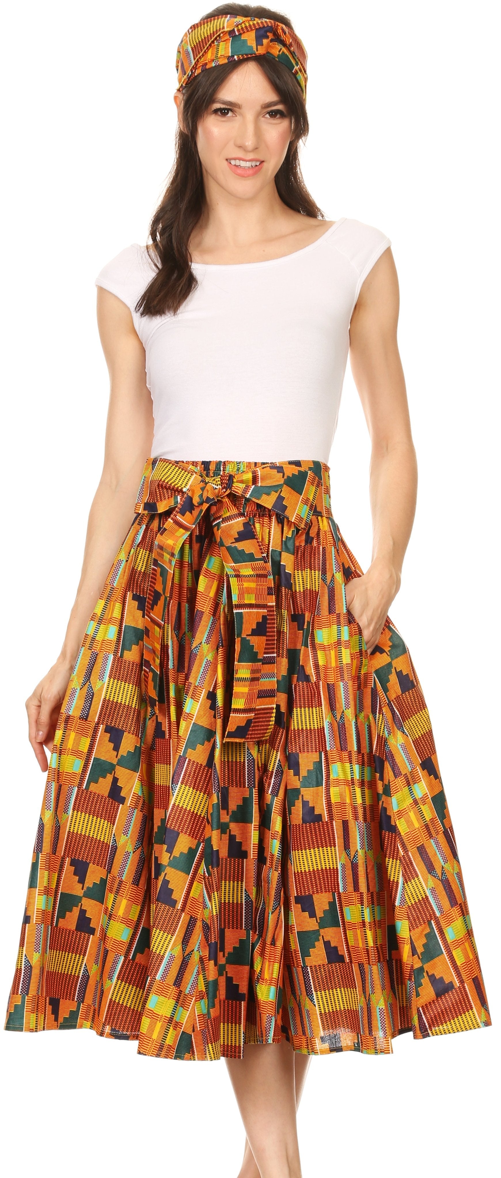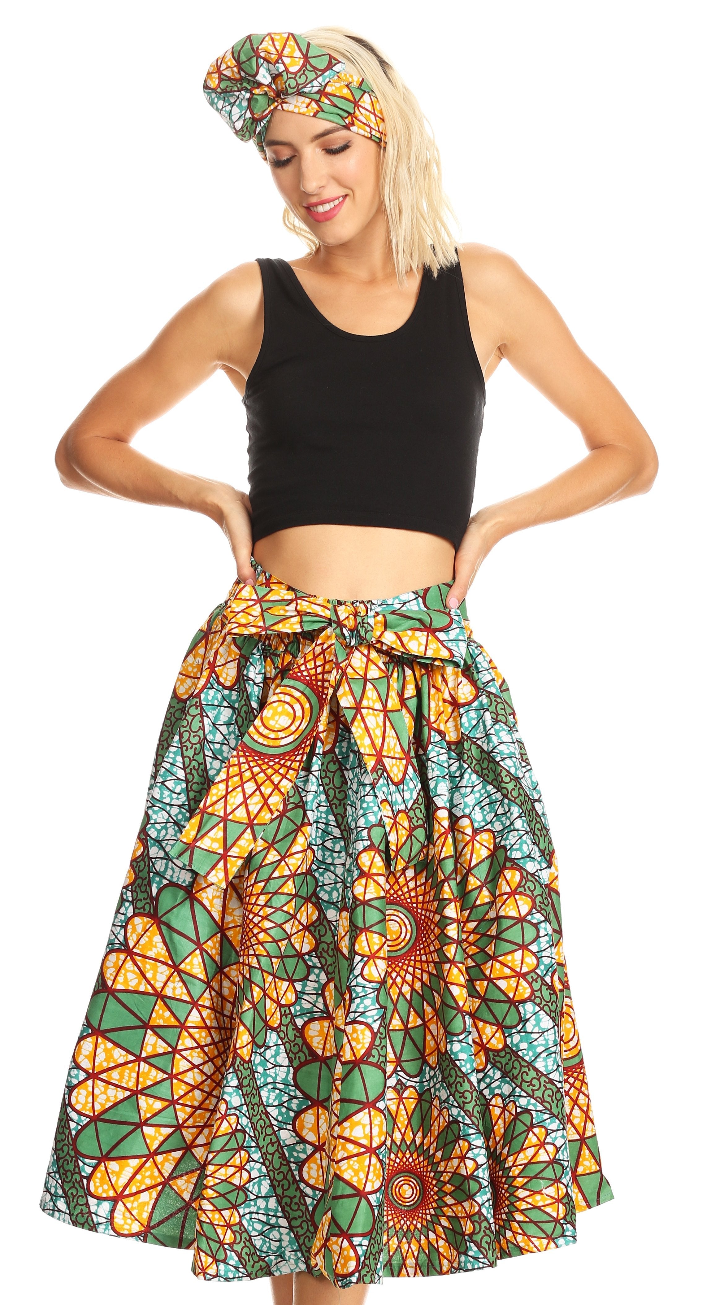 • Lovely African Dutch Ankara wax printed cotton skirt. Full circle with wide elastic band and wide self-ties. Gorgeous print, perfect calf length. This skirt has inseam side pockets. This skirt comes with a head scarf in the same print.
